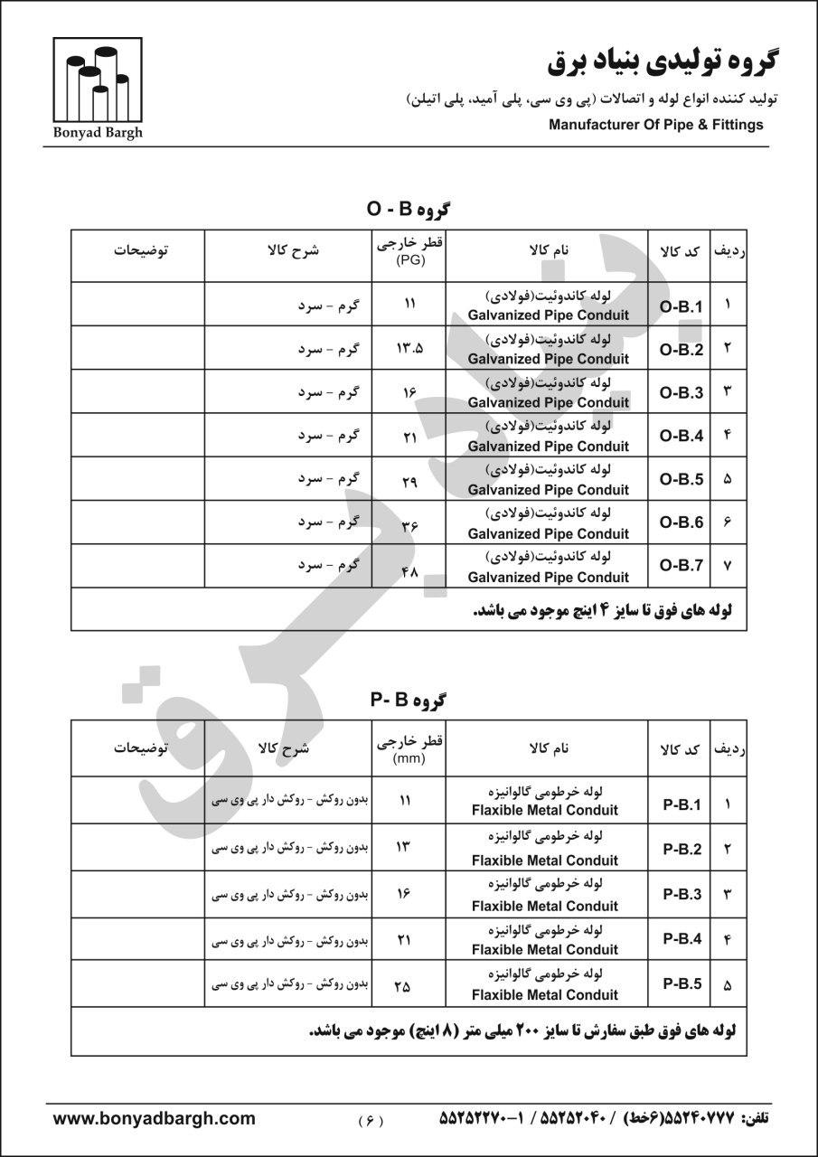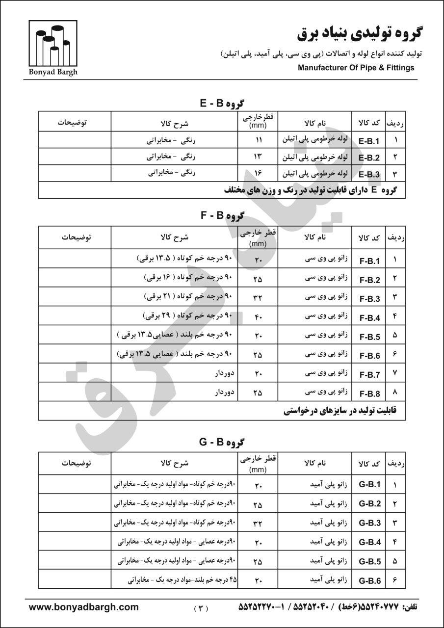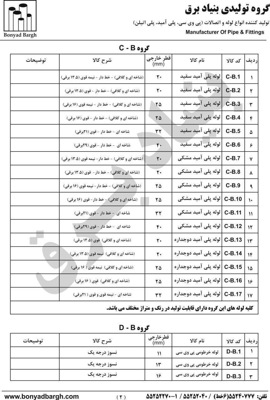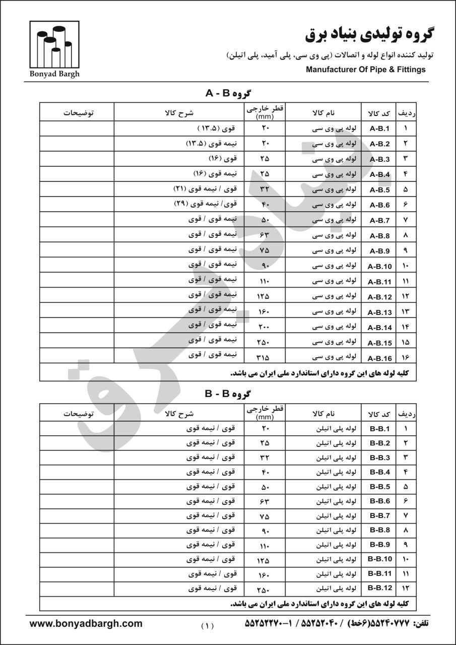 لیست محصولات لوله پی وی سی و لوله پلی اتیلن